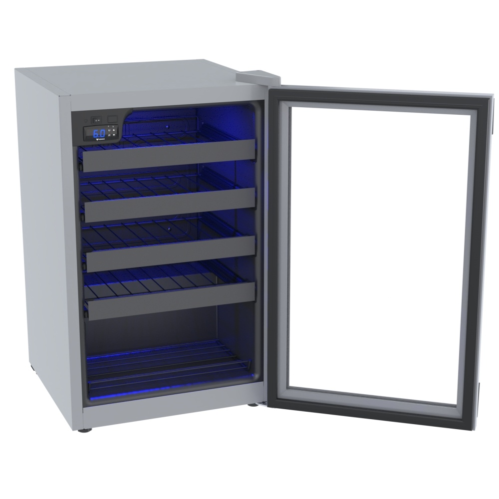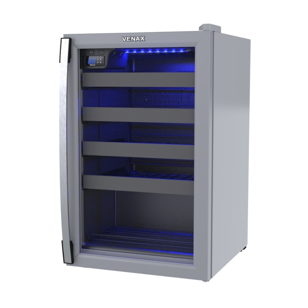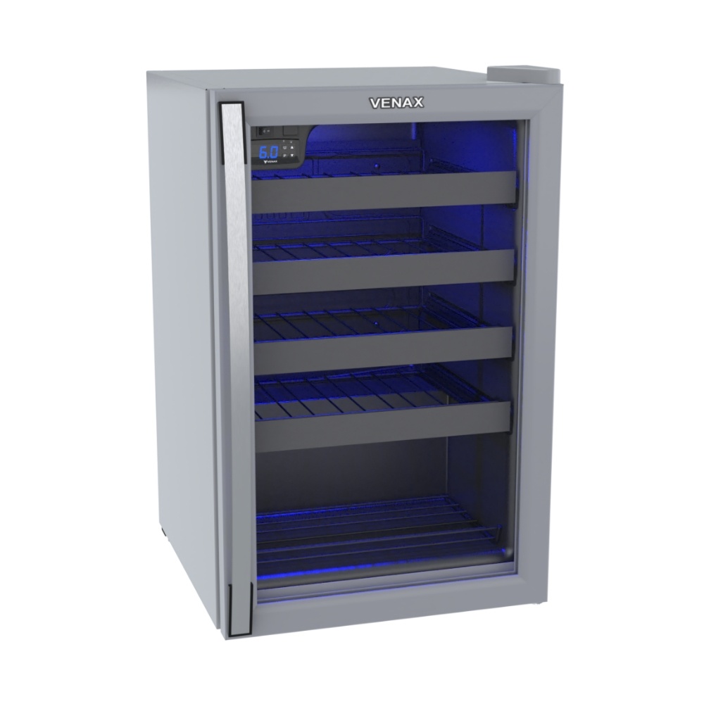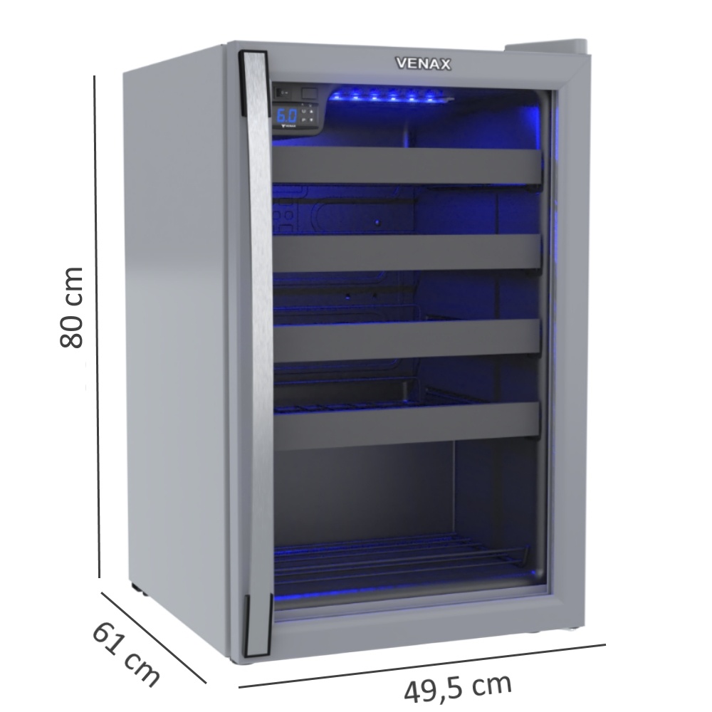 Adega Piubella 100. Conta com Capacidade para até 24 Garrafas com Diâmetro de até 9cm. Porta de Vidro Duplo Low-E, Puxador em Alumínio Escovado, Controle de Temperatura Digital Regulável de 6ºC até 20ºC, Iluminação Interna em LED na Cor Azul, Prateleiras Deslizantes, com Sistema de Refrigeração por Compressor.