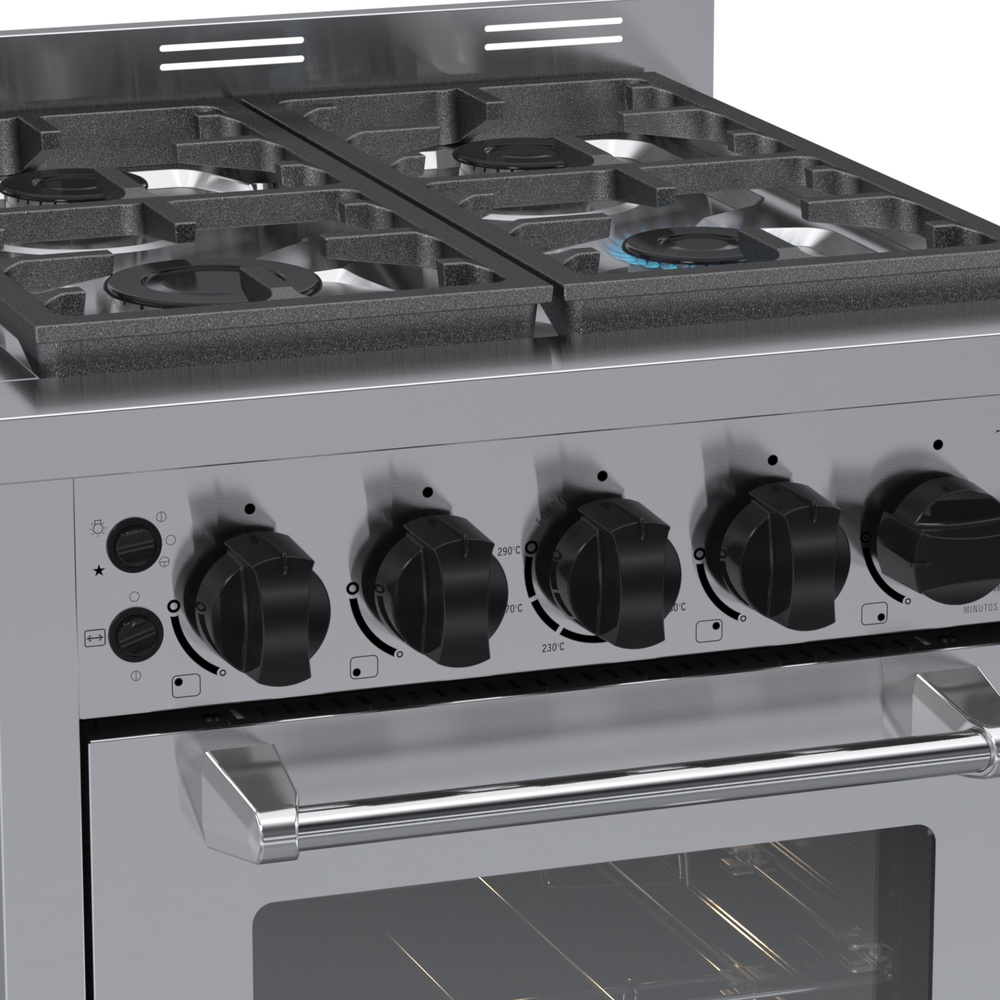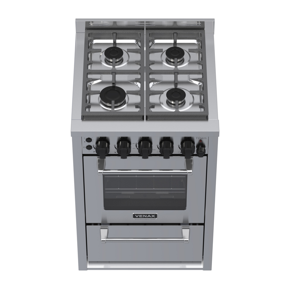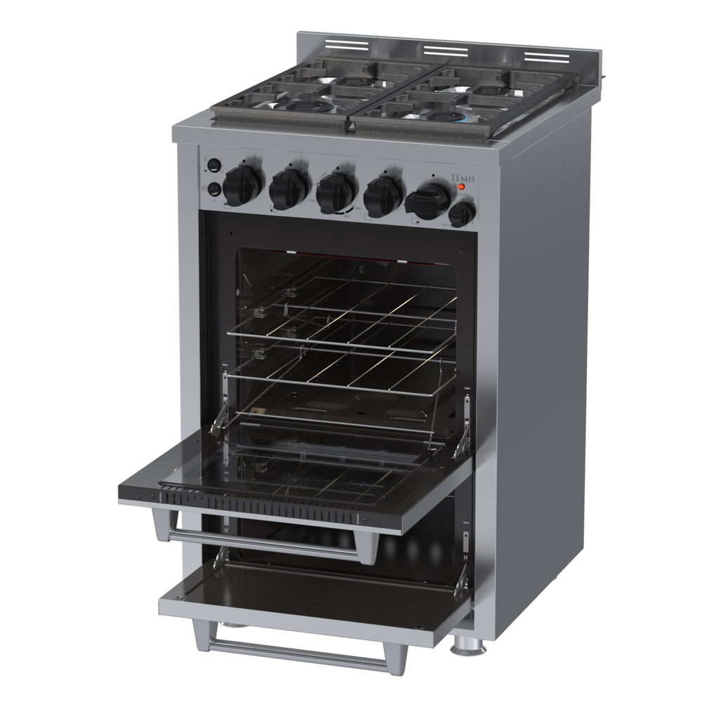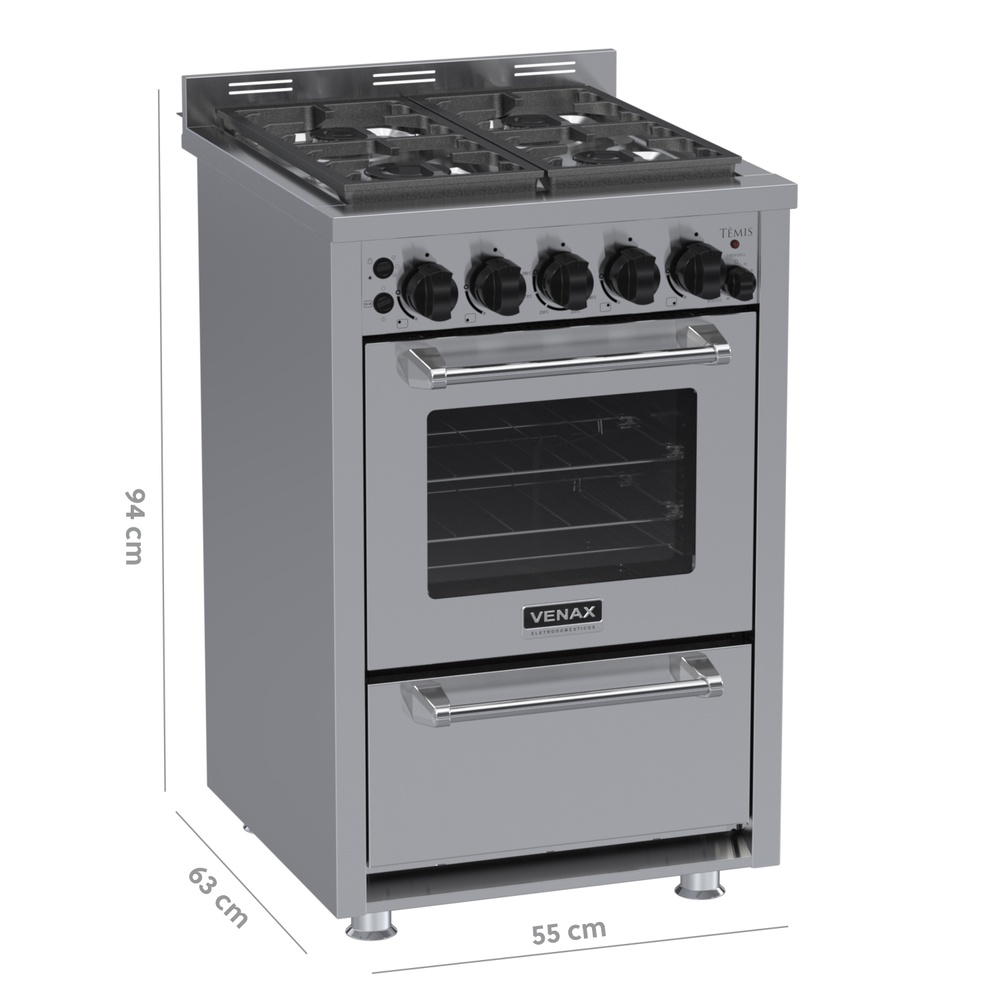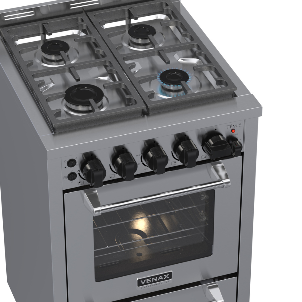Fogão de Piso 4 Bocas Têmis, com Acendimento Automático Total, Com Estufa, Visor na Porta do Forno, Trempes Duplas de Ferro Fundidos, Mesa de Inox, Luz no Forno, Puxador na Porta do Forno e Estufa em Aço Cromado,Laterais em Inox, Portas Removíveis, Grill Dourador no Forno com Timer, Duas Grades Deslizantes no Forno, Bandeja Coletora de Gordura no Forno, Um Espeto Giratório, Forno Easy Clean.