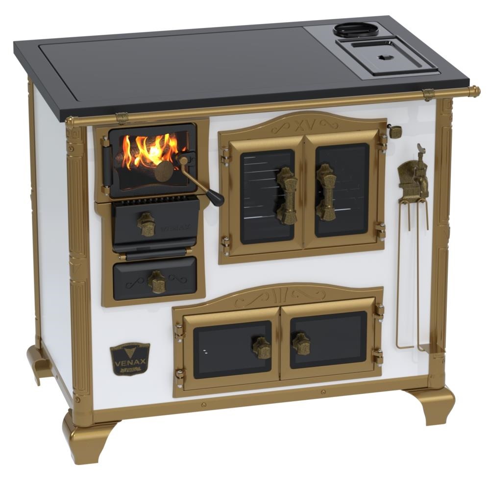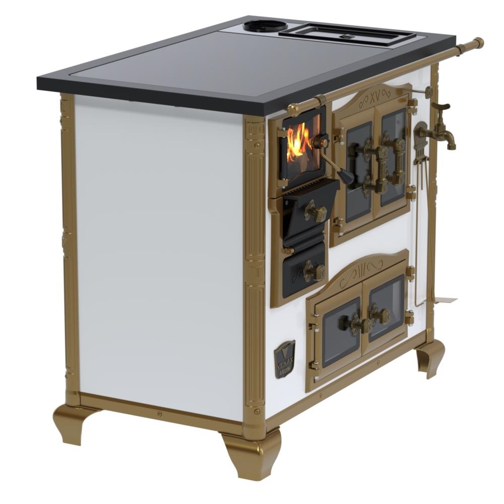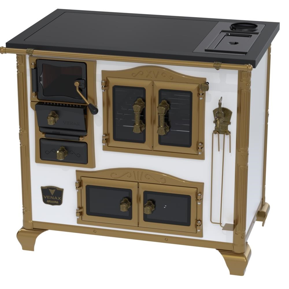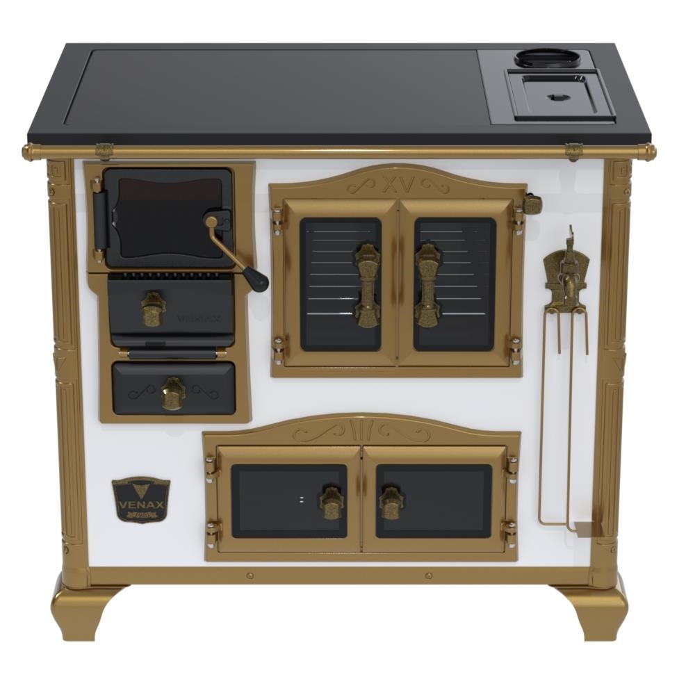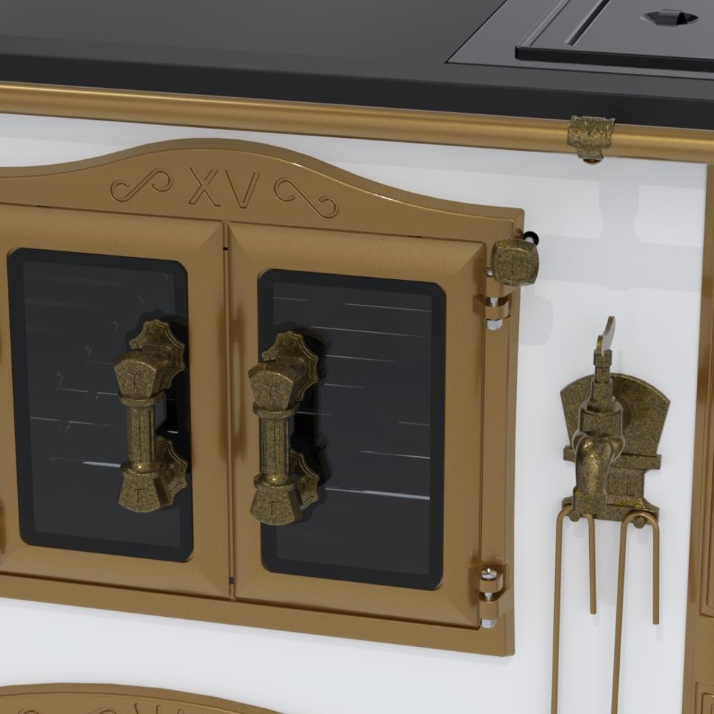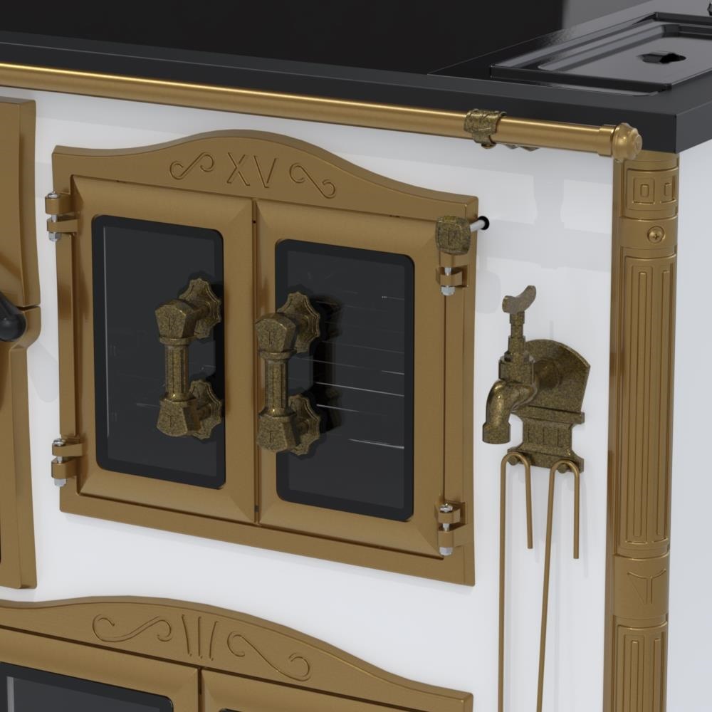 Fogão a Lenha Nº2 Imperador Vitreo Premium, Chapa Vitrocerâmica com Moldura em Aço na Cor Preta, com Saída para Chaminé na Chapa, Caldeira em Alumínio Teflonada, Corpo em Chapa QCV Esmaltada, Tranca na Porta da Fornalha, Porta Dupla no Forno e na Estufa. Portas da Fornalha, Forno e Estufa de Vidro. Puxadores, Guarnições, Cantoneiras e Suportes dos Varões Estilo Século XV, com Acabamento em Tom Ouro Velho.