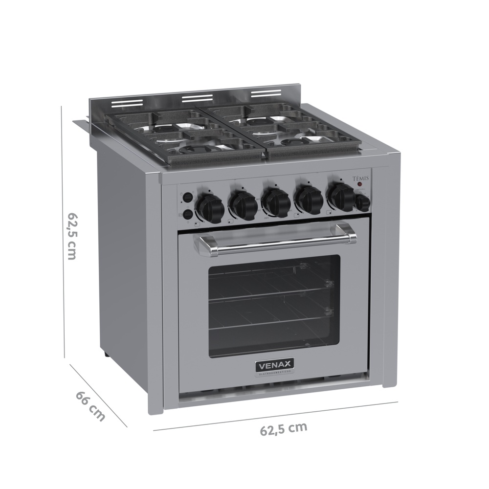 Fogão de Embutir 4 Bocas Têmis, com Acendimento Automático Total, Visor na Porta do Forno, Trempes Duplas de Ferro Fundidos, Mesa de Inox, Luz no Forno, Puxador na Porta do Forno em Aço Cromado, Porta Removível, Grill Dourador no Forno com Timer, Duas Grades Deslizantes no Forno, Bandeja Coletora de Gordura no Forno, Espeto Giratório, Forno Easy Clean.